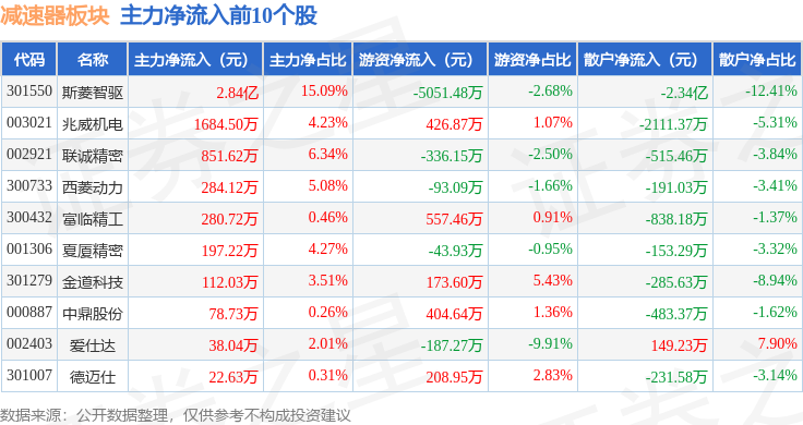 从资金流向上来看,当日减速器板块主力资金净流出5.69亿元,游资资金净流出4883.26万元,散户资金净流入6.18亿元。减速器板块个股资金流向见下表: